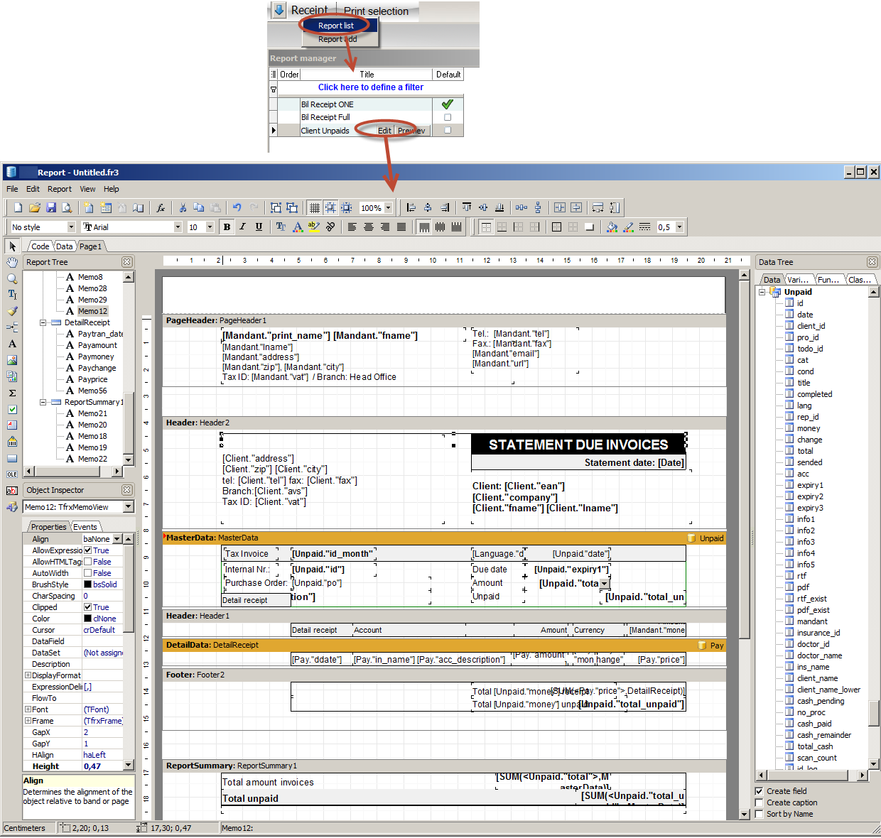 All reports are expandable and modifiable by the user. With a simple right-click on the print button you can access to the list of reports. These can be copied, modified or you can create new ones.